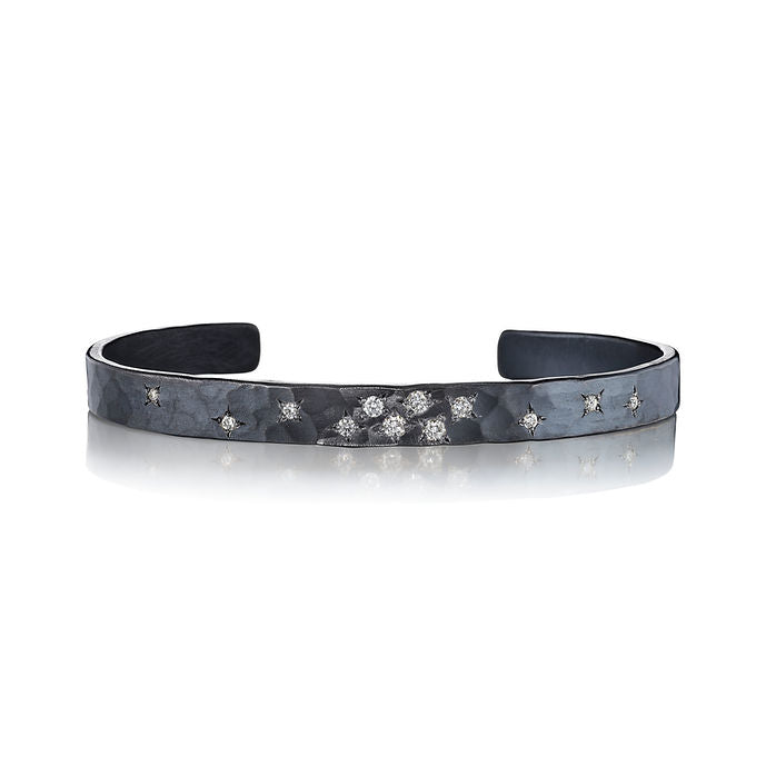 Hammered 6mm cuff in oxidized sterling silver with 12 brilliant diamonds.