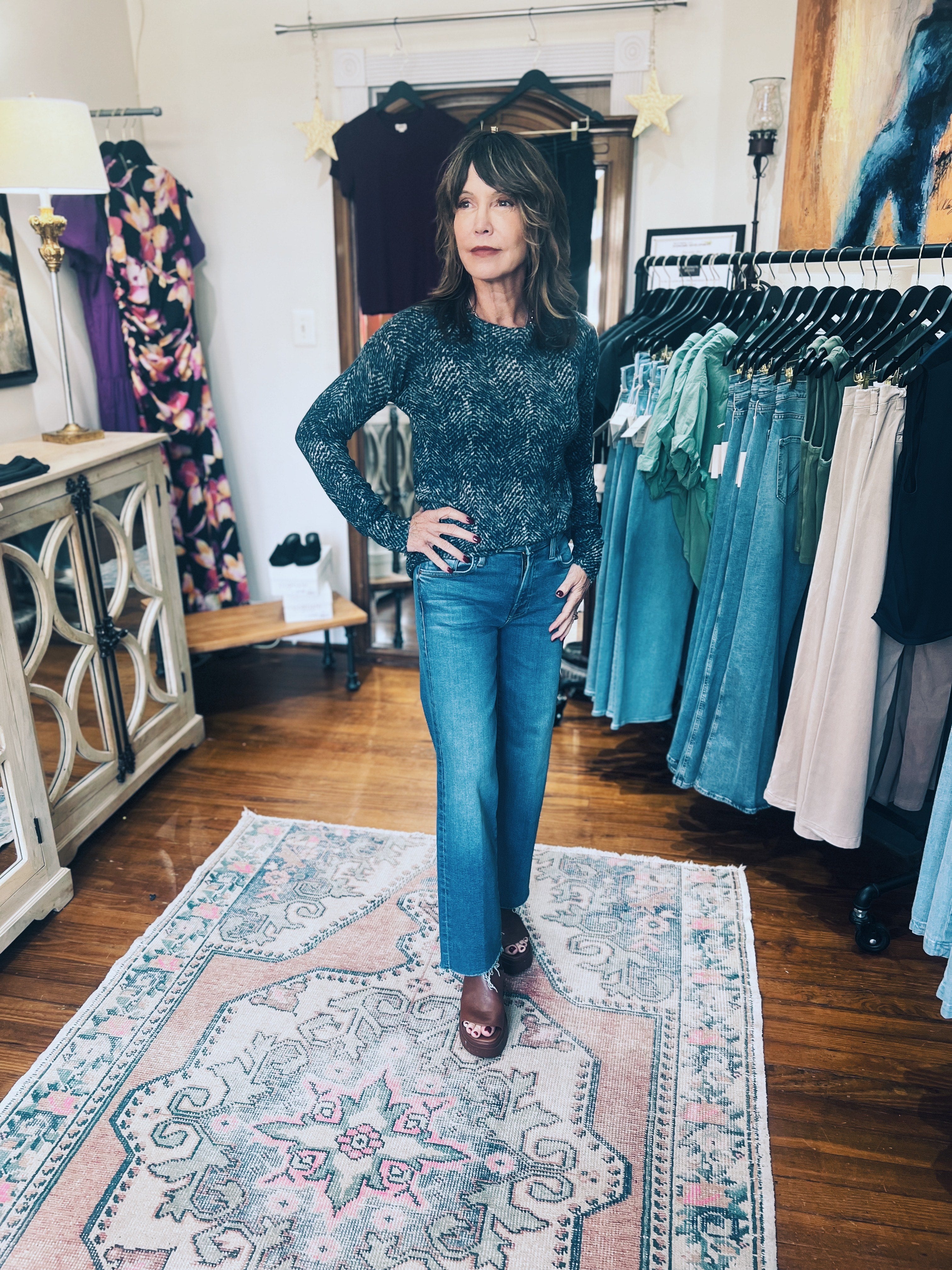 Autumn Cashmere Herringbone Print Raw Edge Crew-Raw Denim Combo