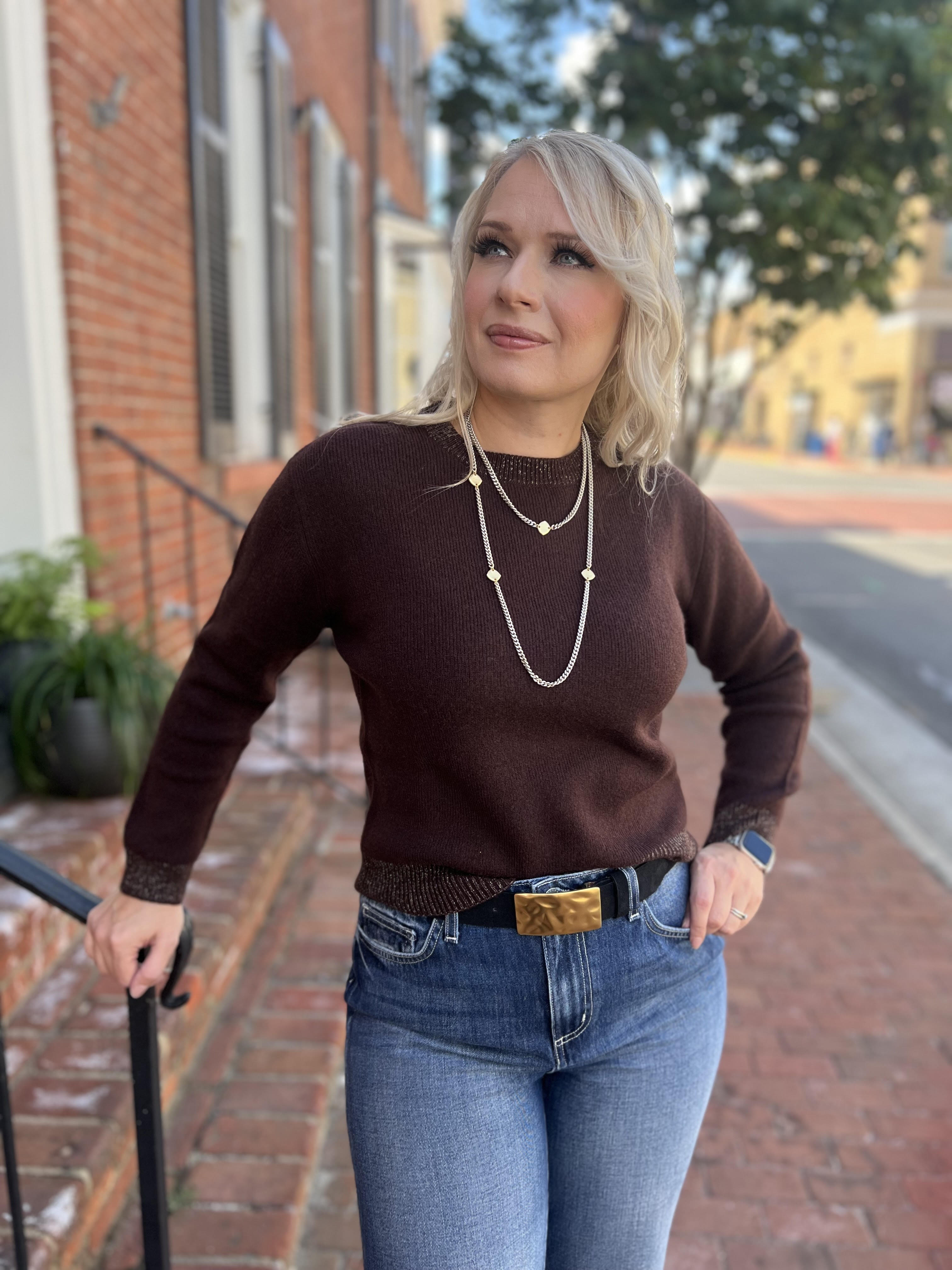 Jumper 1234 Contrast Lurex Rib Crew Sweater-Hickory/Gold