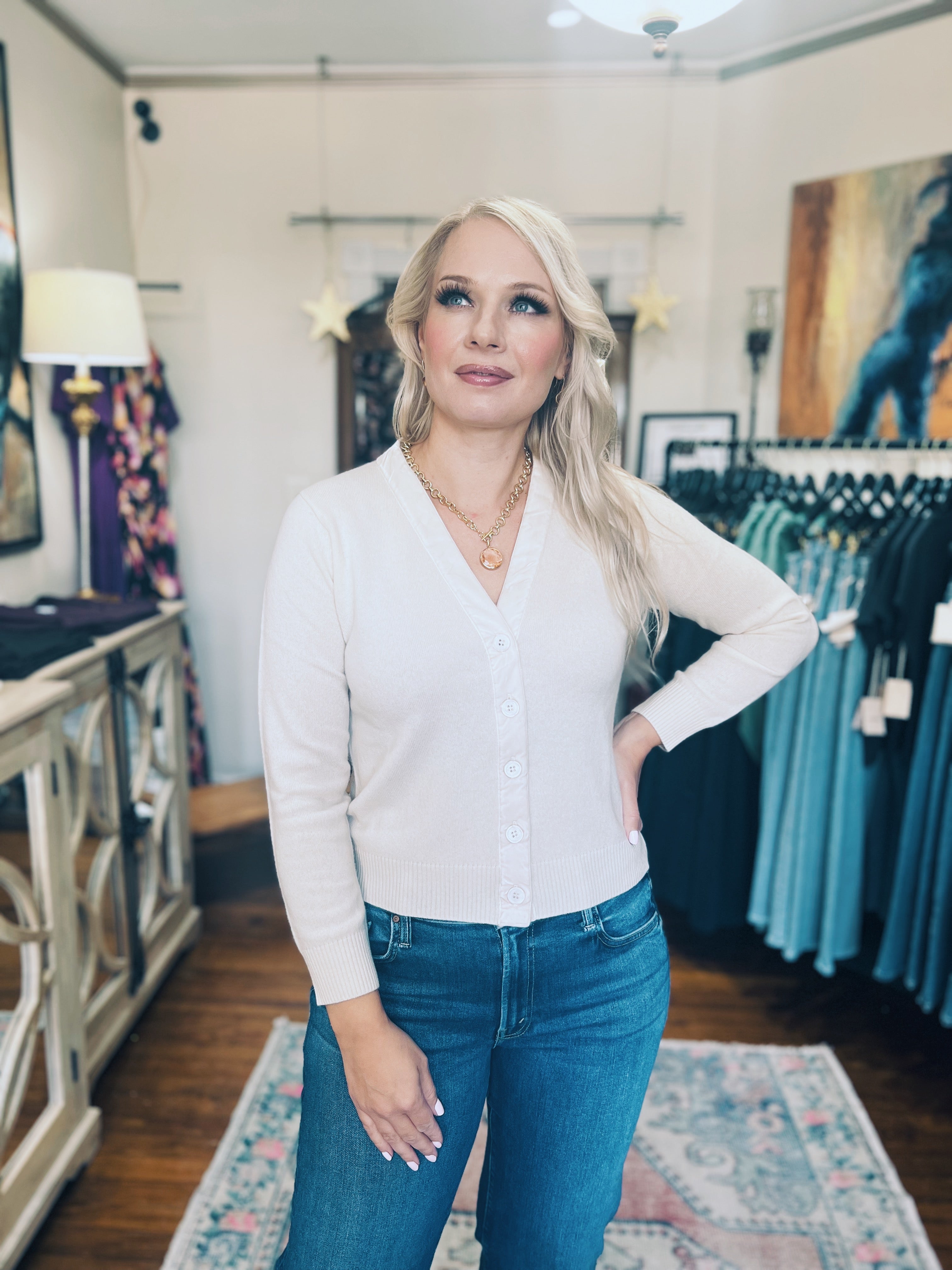 Jumper 1234 cashmere wool cardigan, vee neck cardigan in our fabulous cashmere and wool blend with matching velvet trim. This is going to be one of our go to cardigans this season, it's a neat fit so do size up if you want a more boyfriend feeling.