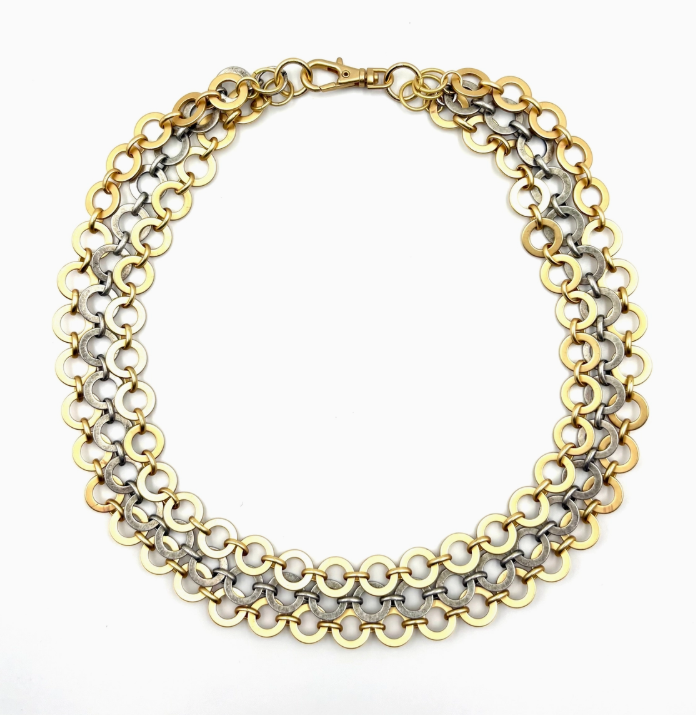 Effortlessly elevate your layered look with this standout piece, featuring multi-washer chains in a striking mix of gold and silver.  18 kt gold plate over brass & antique silver over brass  17" in length