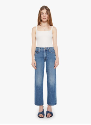 Mid-rise jeans with a wide straight leg, zip fly and clean ankle-length inseam. Made from stretch denim, Tambourine Man is a medium wash with whiskering and fading at the knee.