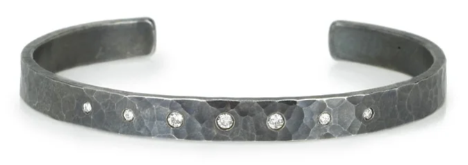 Hand fabricated, hammered flat cuff in blackened sterling silver with 7 brilliant diamonds Dimensions: 6mm cuff width Diamond TCW: .17 ct Designed and entirely hand fabricated in the United States.