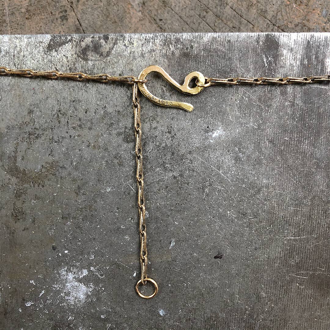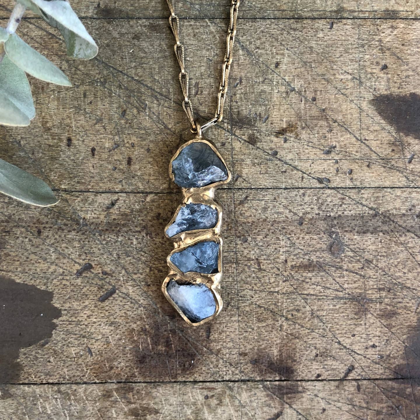 Inspired from waves crashing where the ocean meets the beach, four aquamarine are embedded in brass and anchored on our signature brass chain with a handmade clasp.
