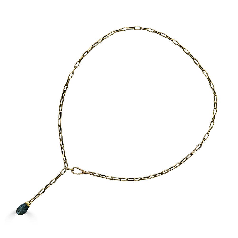 Versatility and uncompromised style are the hallmarks of this exquisite gold chain lariat necklace. This piece is an update to a loved classic, featuring a labradorite pendant that brings defining character to this necklace. Wear on its own or layered with delicate necklaces from your collection.