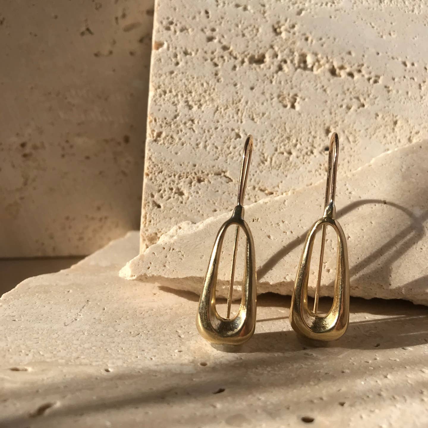 Hand carved and lost wax cast in either brass or sterling silver. Hangs from coordinating 14k gold fill or sterling silver ear wires. MEASURES: 1.5" x .5"
