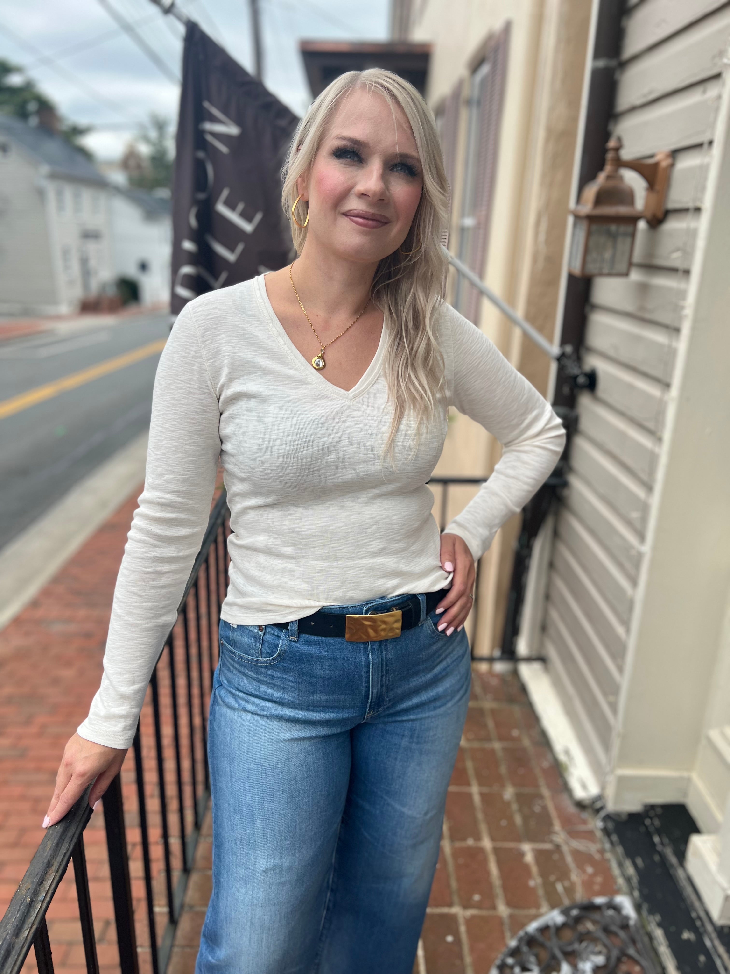 Lilla P Rib Slub Long Sleeve V Neck Top-Lichen or Talc