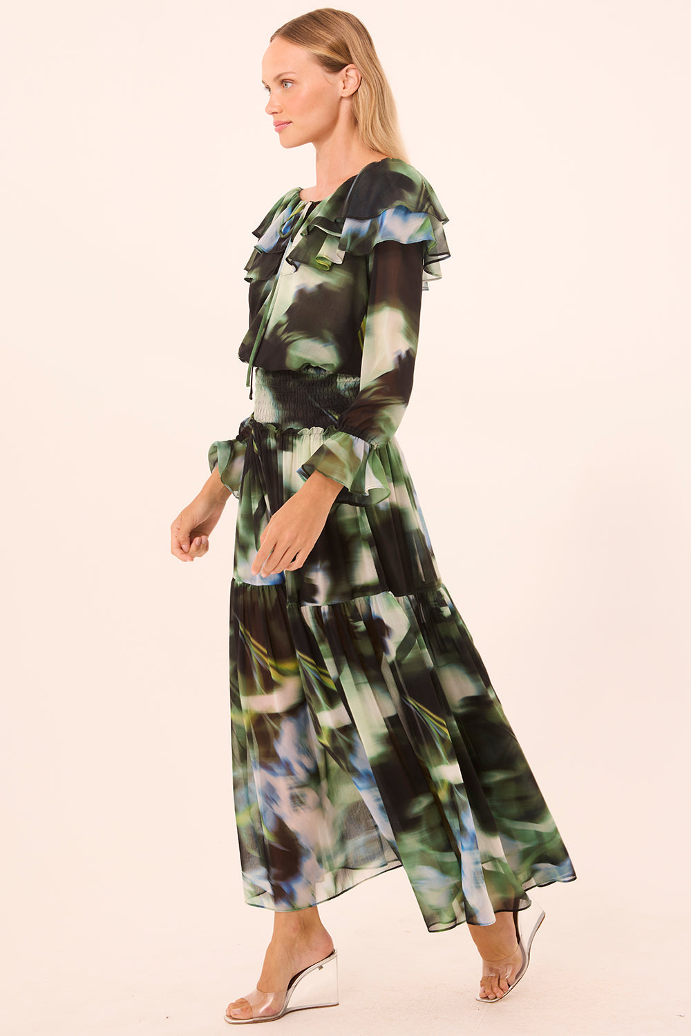The Polly skirt is an effortless maxi silhouette cut from our blurred Casablanca lily printed chiffon. Designed with a wide smocked elastic waistband, it flows into a relaxed skirt with a front slit that starts above the knee. Pair it with the coordinating Luka Top.