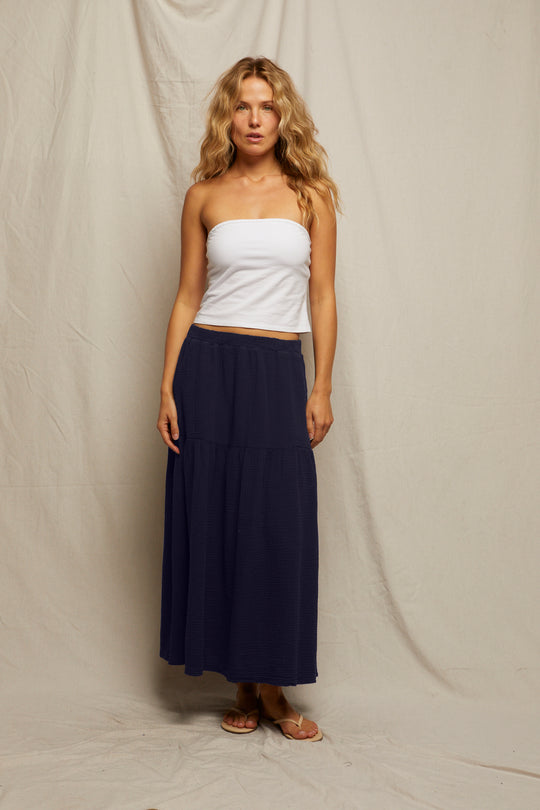 The bella skirt is what happens when easygoing meets elevated. made from our signature gauzy cotton, it’s lightweight, breezy, and gives off serious “i just got back from vacation” energy. the mid-thigh seam adds just the right amount of shape, while the full-length silhouette keeps things flowy and flattering.