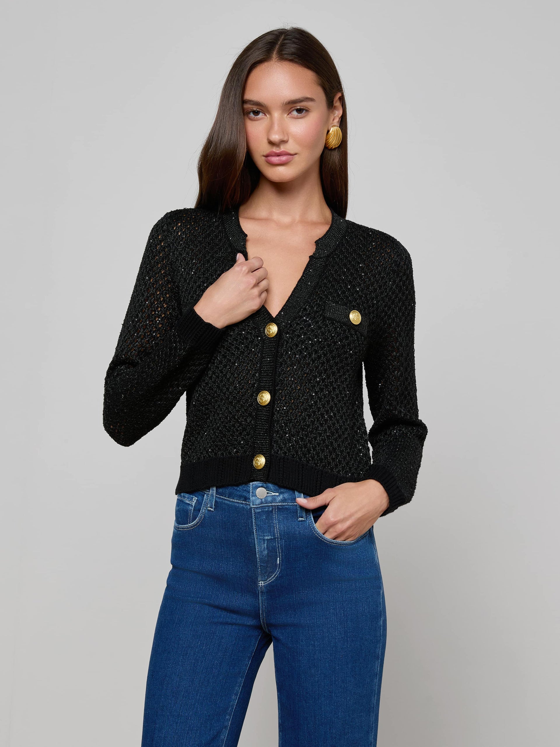 Add a little sparkle to your look with this easy lightweight layer that strikes the perfect balance between polished and cozy. Now in black.