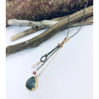Handcrafted necklace with oxidized/textured Sterling Chain, gold fill faceted bead accents, dangling Rose Quartz, Tourmaline and Labradorite drops 17"