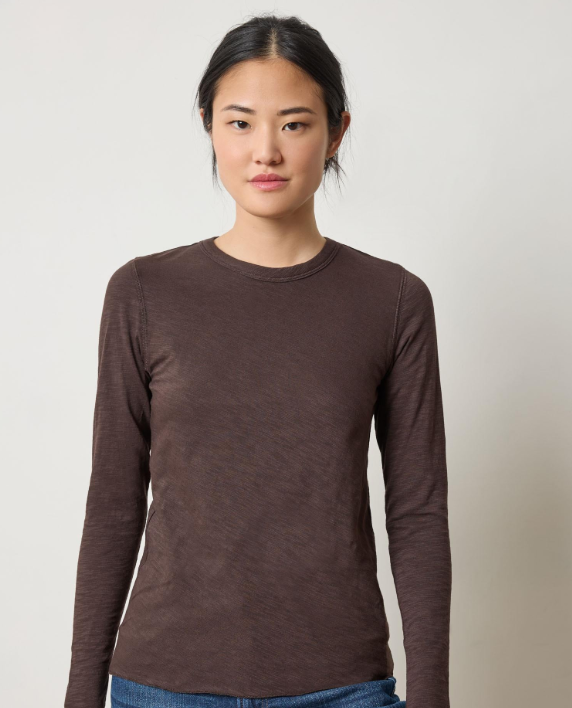 The Long Sleeve Bias Cut Crewneck in our mid-weight cotton slub is a fresh take on a classic crewneck. The body and rib trim at the neckline are cut on the bias, creating a flattering fit that gently hugs the body. Merrow edges at the hem and sleeve openings add a subtle, undone touch for a look that feels effortless and modern.