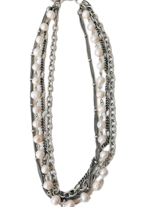Necklace made of multiple chains and pearl rosary; 17"