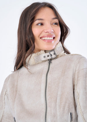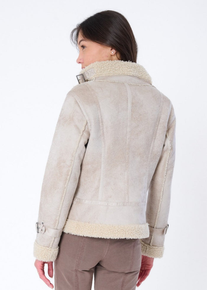 Throw it back and turn heads in the Osha Faux Shearling Distressed Scuba Suede Biker Jacket is a timeless blend of moto-edge and plush comfort that’s ready to rewrite your fall wardrobe. With its buttery-soft distressed faux suede exterior, warm faux shearling lining, and iconic asymmetrical zip closure, this jacket nods to vintage biker style without losing an ounce of modern refinement.