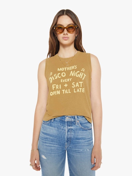 Let's boogie. A cropped muscle tee with a crewneck and boxy fit. Cut from 100% cotton, the faded brown tank features a yellow text graphic on the front.