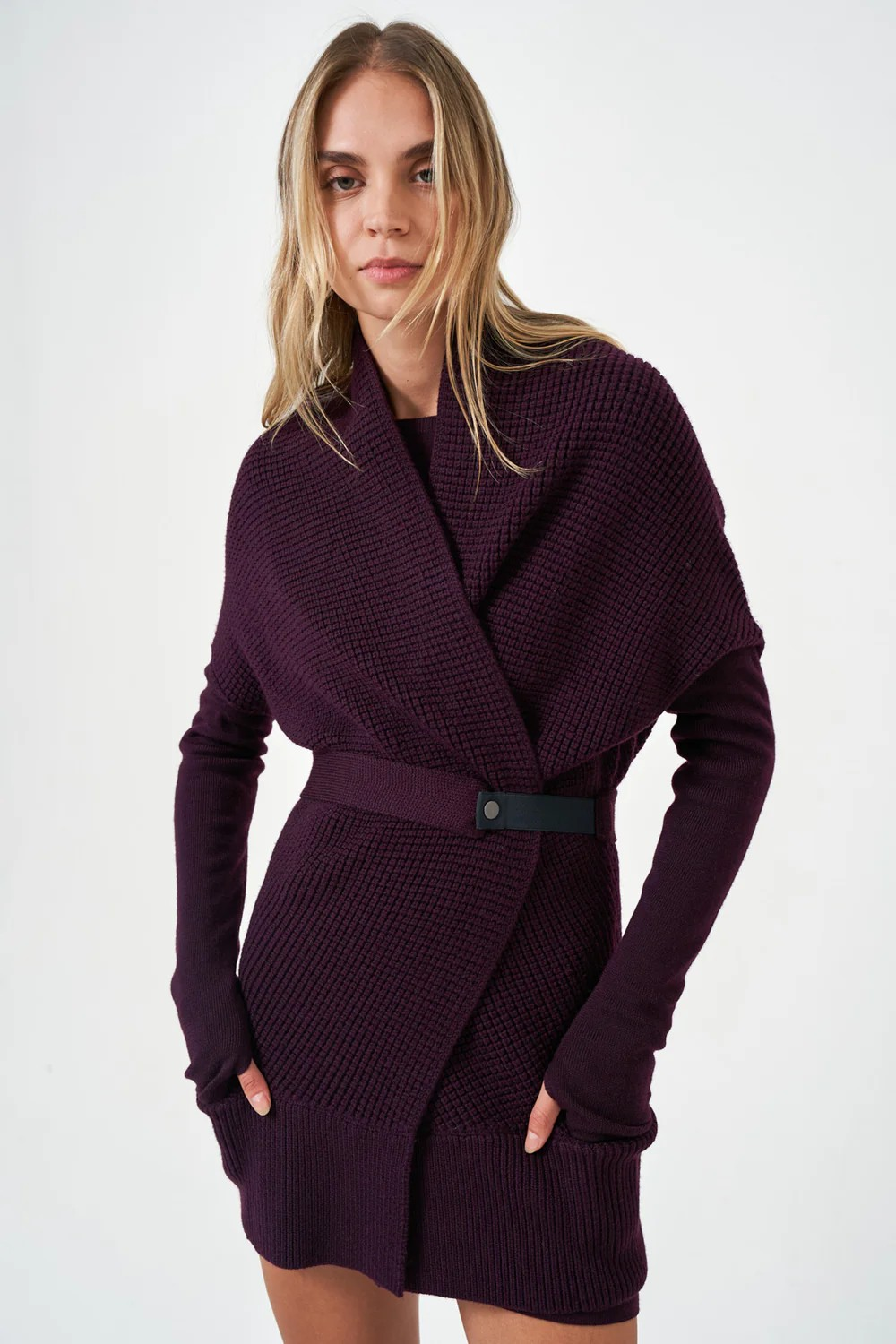 Easy cardigan shape features Chunky Stitch body and fine gauge sleeves with unique thumbhole details. Can be worn upside-down for more cropped form. 100% Merino Wool