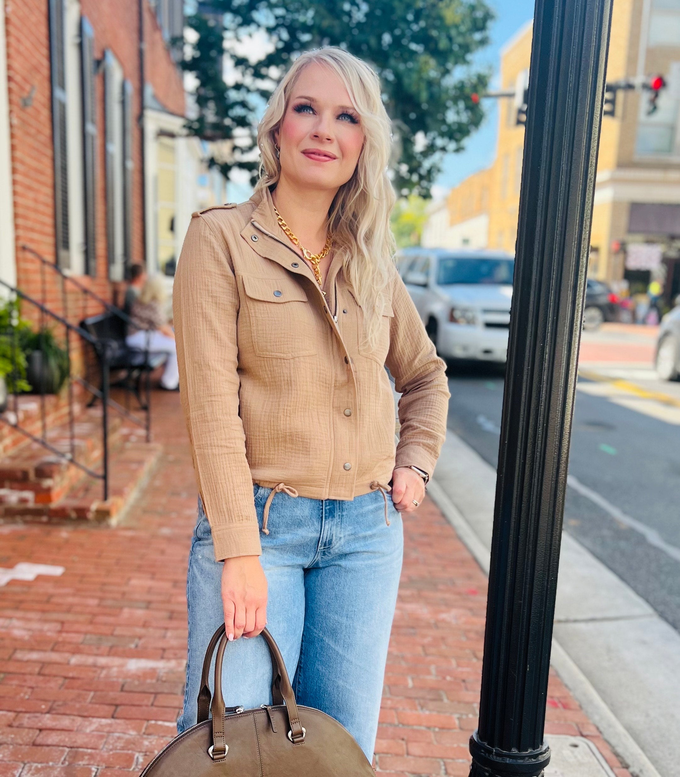 The Collins Jacket is a clean-cut outer layer made of a heavy, yet breezy double gauze—perfect for transitional weather and chilly, summer nights. With a military-inspired design, the taupe jacket features a toggle-drawstring hem, shoulder epaulets, cargo chest pockets, and breathable back flap.