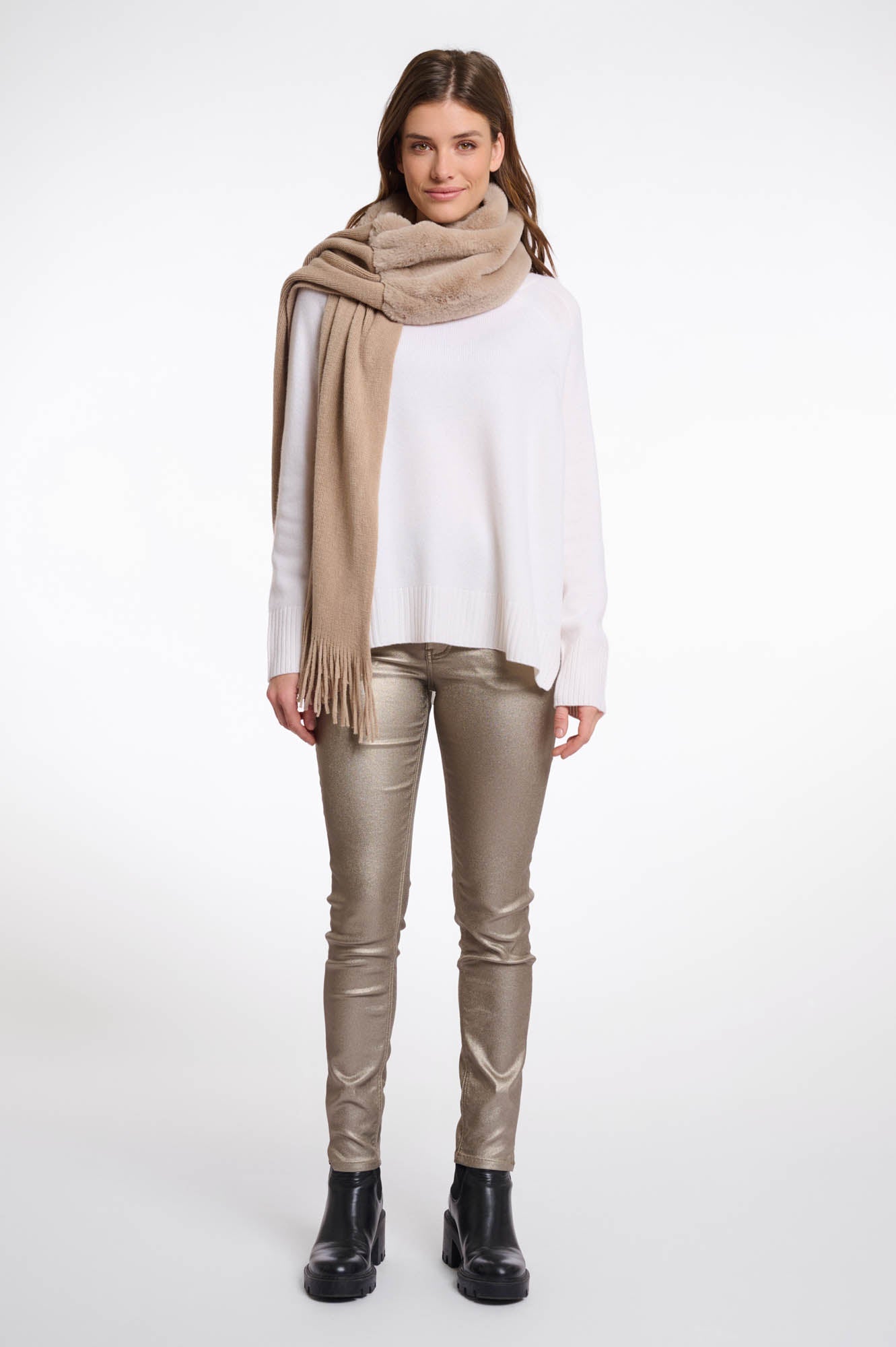 Tonal woven scarf. This scarf features faux-fur details, wide fringed ends and a super soft feel.