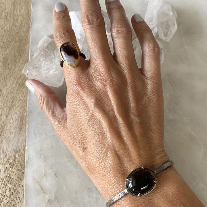 Oxidized Hammered Sterling Silver Bracelet with Oval Smokey Quartz Gemstone Station