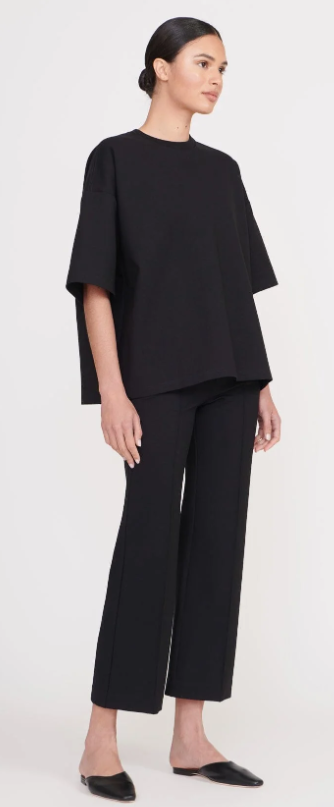 An ankle length pant made out of a stretchy ponte knit fabric with princess seams at the front and a center back zipper.