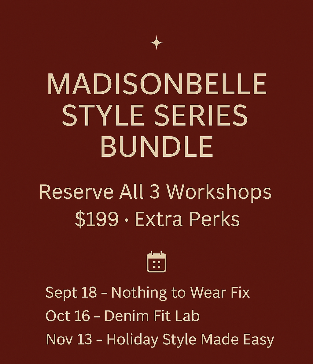 Want it all? Reserve your spot in all three Madisonbelle Style Workshops and save while you style. This bundle locks in your seat for Nothing to Wear Fix, Denim Fit Lab, and Holiday Style Made Easy—plus $75 in Madisonbelle credits to shop with along the way.