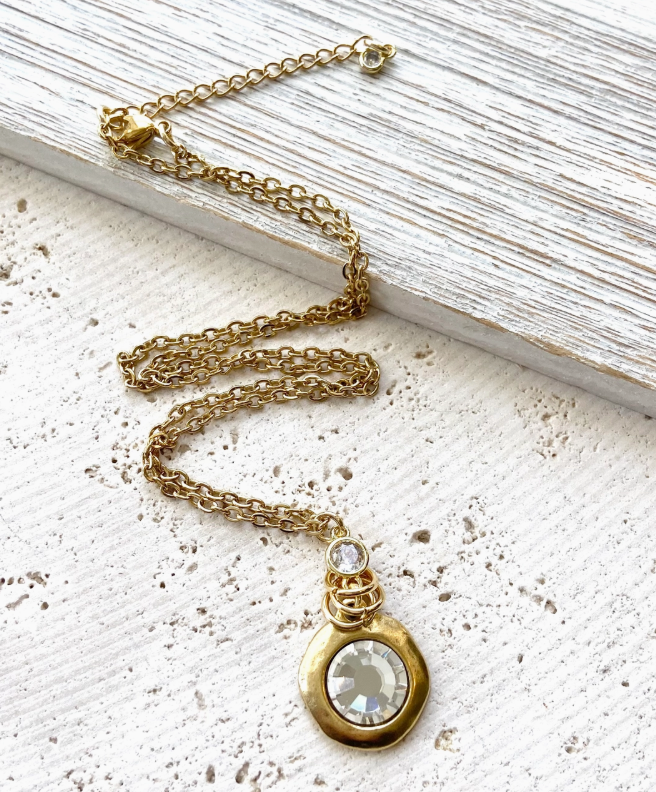 This sparkly clear Swarovski crystal is hand casted in antique gold. Adjustable 18”-20” Great layering piece!