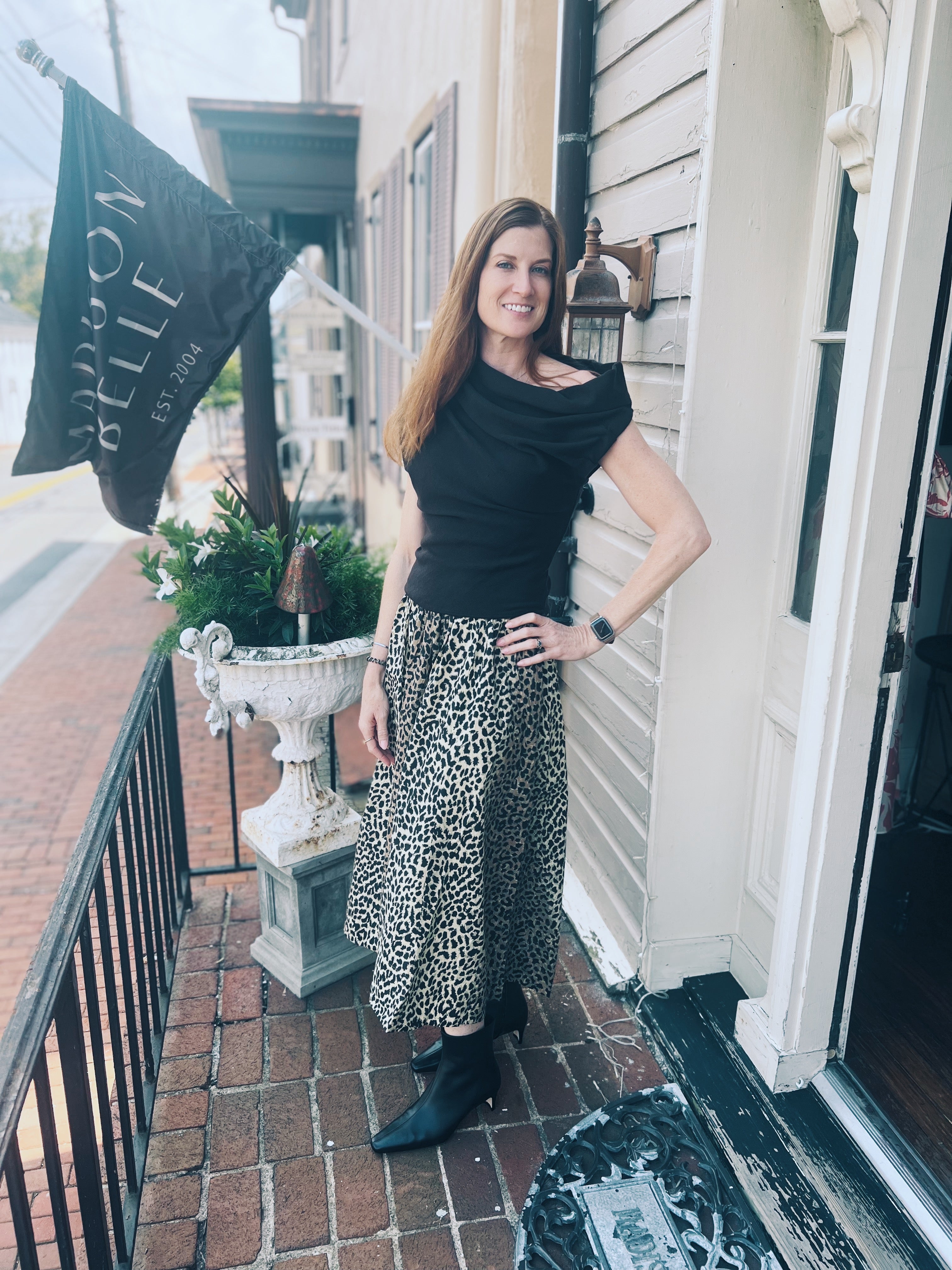 Gwynn is a cotton A-line skirt in a modern animal print. It has a high low silhouette, an elasticized waist and side seam pockets.
