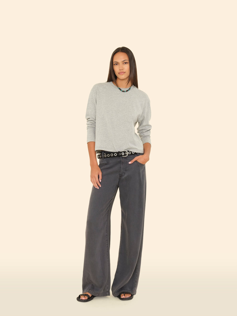Forever Denim. Nixon is made in our drapey, ultra-soft lyocell denim. This high-rise five-pocket pant features a zipper fly, elasticized back waist, and a wide leg.